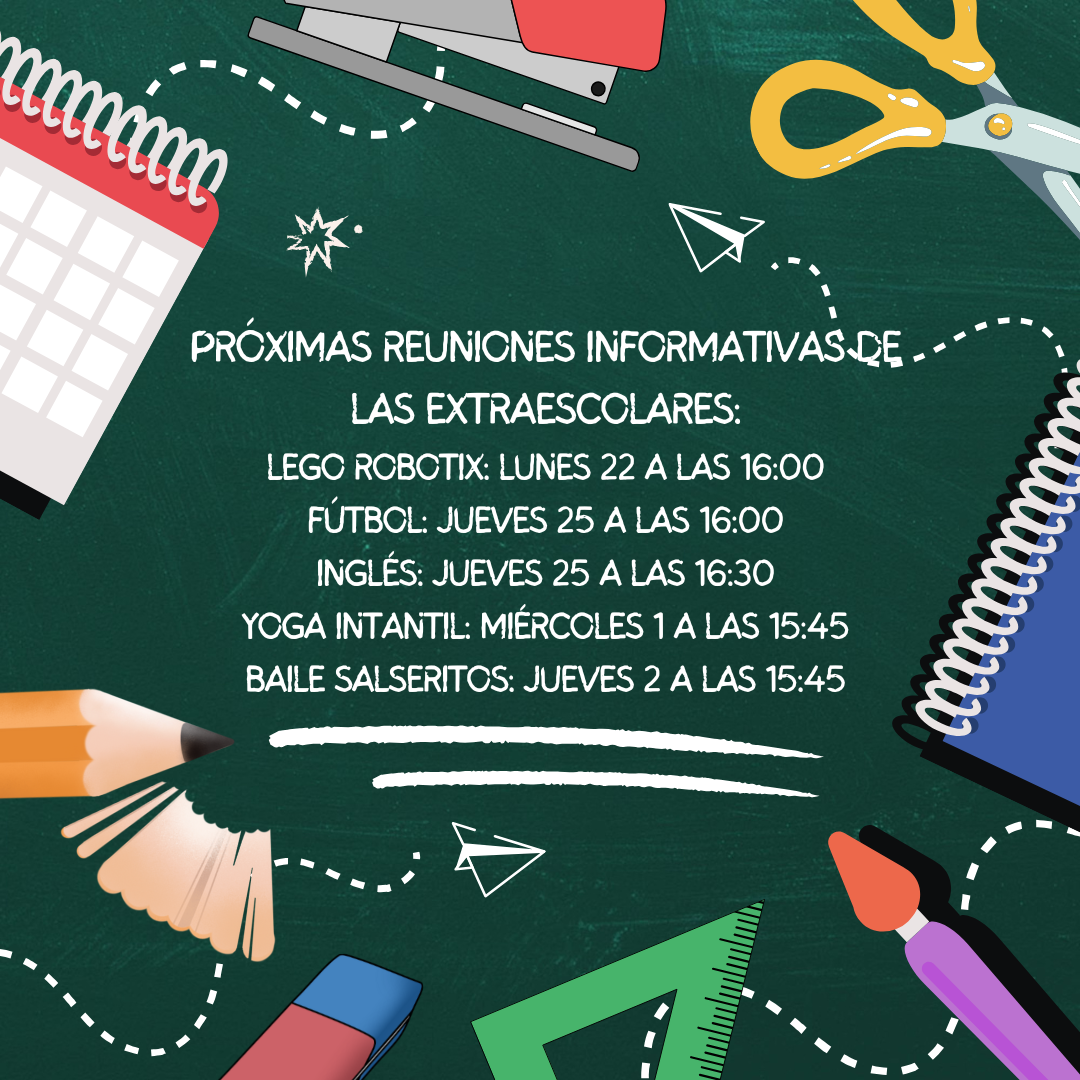 Os dejamos la programación de las próximas reuniones informativas de las extraescolares, que serán a la entrada del edificio de primaria: